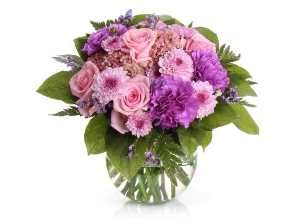 Matala, pyöreä kimppu kauden kukista! Vaaleanpuna ,lila sävyinen kimppu.